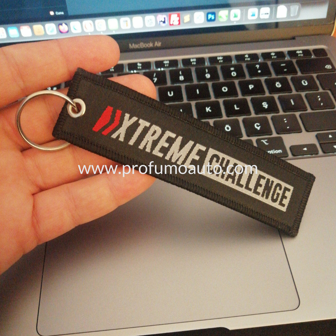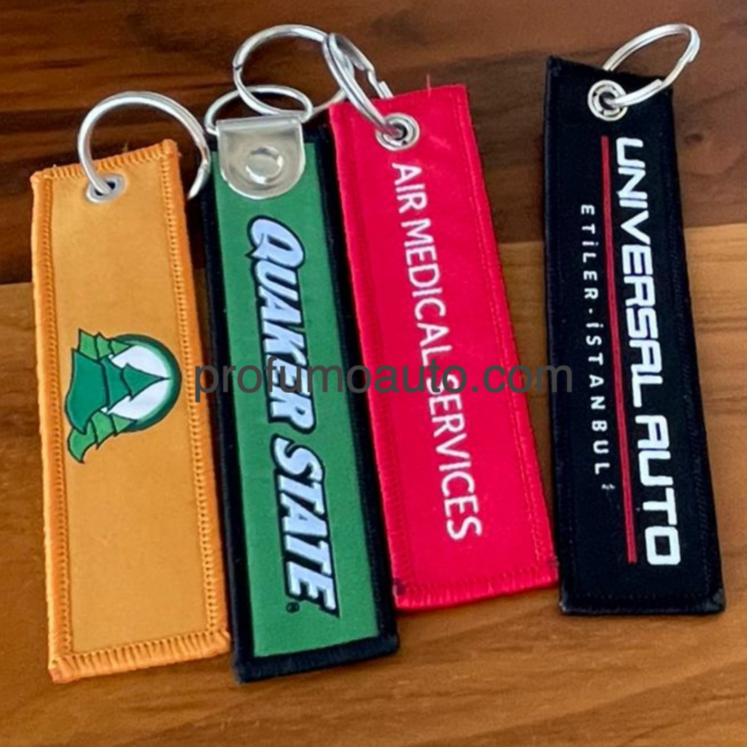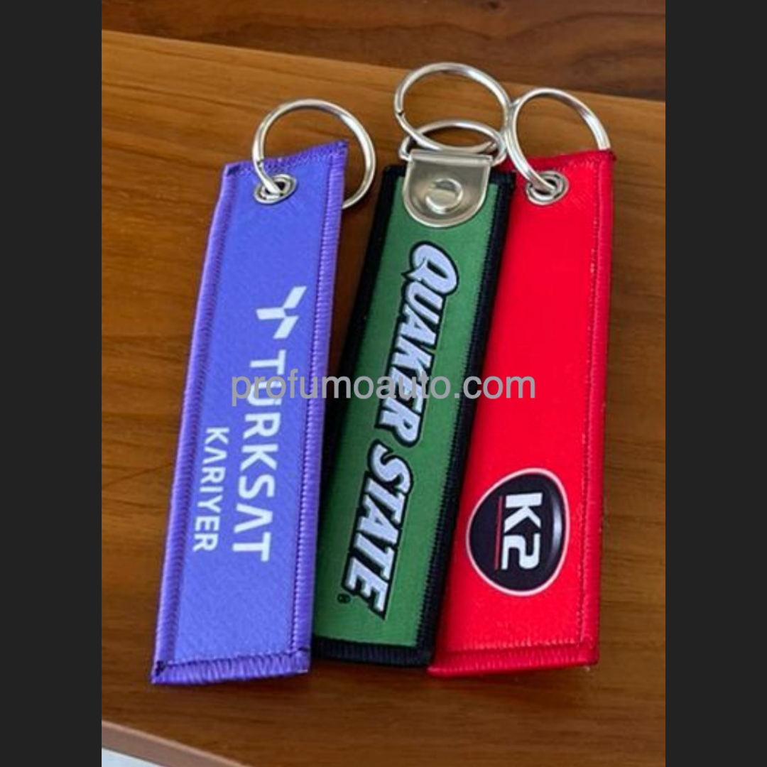 Portachiavi in tessuto personalizzato con logo ricamato o tessuto, disponibile in vari colori e dimensioni. Ideale come gadget promozionale aziendale.